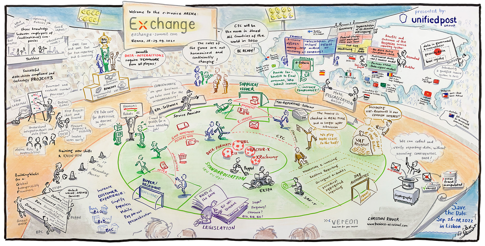 You may view all key-topics in the new “Big Picture of E-Invoicing" drawn by Chris Ridder - an entertaining and compact graphic recording on www.exchange-summit.com/insights/graphic-recording.